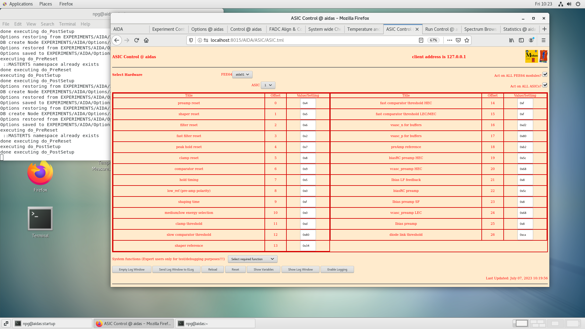 Test of AIDA FEE64 d8:80:39:41:f6:ee ( aida01 ) - HDMI connector replaced. Cooling plate fitted - no base plate. ISOL test station STFC DL, T9 Pulser BNC PB-5 Amplitude 0.5V Attenuation x1 Polarity + Frequency 100Hz Tail pulse, decay time 1ms Delay 250ns (min) ASIC settings 2019May22-10.19.28 - attachment 1 Slow comparator 0x80 Options - attachment 2 Adaptor PCB - PJCS FEE64 temperatures OK - attachments 3 System wide checks - attachments 4-9 FEE64 module aida01 global clocks failed, 6 Clock status test result: Passed 3, Failed 1 FEE64 module aida01 failed Calibration test result: Passed 3, Failed 1 Timestamp RAM values OK? Statistics OK - attachments 10-11 Good WAVE events reported? LEC spectra - attachments 12-15 Data observed for all channels of all ASICs - double peaking observed - may be due to incomplete FEE64 assembly? See attachment 17 Hit/HitRate spectra - attachment 16 OK *except* 1.2.L fast comparator missing no WAVE data