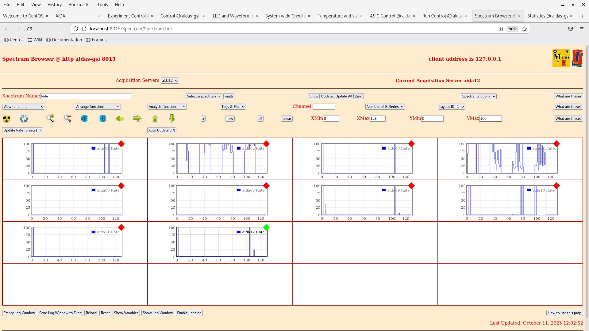 10.00 Water flow & temp OK Power ON All system wide checks OK CAEN N1419ET ch 2 - all outputs non-floating ( internal LK fitted ) Standard coaxial HV cable chained to aida12, aida03 & aida11 aida04 LK1 ( local gnd ) fitted ground cable from aida04 adaptor PCB ground to aida12 to aida02 aida03 LK3 ( PCB gnd ) fitted BNC PB-5 amplitude 10.0V attenuation x10 decay time 1ms polarity - frequency 25Hz test + cable and test + chain removed test - direct from PB-5 to aida02 *only* DSSSD bias -120V -6.105uA - attachment 1 FEE64 tempweratures OK - attachment 2 slow comparator 0x64 ADC data item stats - attachment 3 Note aida04 asic #1 u/s ASIC mezzanine to be replaced aida10 asic #4 v. high rates observed see https://elog.ph.ed.ac.uk/AIDA/901 attachment 45 ASIC/cable/wafer issue ? rate ~ 1600Hz observed for aida02 - pulser All other rates 0Hz per FEE64 Rate spectra - attachment 4 aida02 1.8.L pulser peak width 137 ch FWHM 1.8.W spetcra 20us, 200us & 2ms FSR - attachments 5-10 slow comparator 0x64 -> 0xf ADC data item stats - attachment 11 per FEE64 Rate spectra - attachments 12 & 13 p+n rates entirely dominated by hot channels, otherwise rates ~0Hz n+n rates ~ 200-300Hz/channel slow comparator 0xf -> 0xa ADC data item stats - attachment 14 per FEE64 Rate spectra - attachments 15-17 p+n rates aida12, aida03 & aida11 entirely dominated by hot channels, otherwise rates ~0Hz p+n rates aida10, aida01 & aida09 ~500-1000Hz/channel n+n rates ~ 2000-3000Hz/channel 11.25 Extend HV chain from aida11 to aida09 ADC data item stats - attachment 18 significant decrease in aida09 rate 1.8.W spectra 2ms FSR - attachments 19 & 20 significant improvement in aida09 1.8.W noise aida02 1.8.L pulser peak width 165 ch FWHM ( slow comparator 0xa ), 127 ch FWHM ( 0xf ) 12.00 Extend HV chain from aida09 to aida01 & aida10 slow comparator 0xf ADC data item stats - attachment 21 per FEE64 Rate spectra - attachment 22 1.8.W spectra 2ms FSR - attachments 23-26 significant improvement in aida01 & aida10 1.8.W noise aida02 1.8.L pulser peak width 127 ch FWHM ( 0xf ) 12.35 slow comparator 0xf ADC data item stats - attachment 27 per FEE64 Rate spectra - attachment 28 slow comparator 0xa ADC data item stats - attachment 29 per FEE64 Rate spectra - attachment 30 slow comparator 0x9 ADC data item stats - attachment 31 per FEE64 Rate spectra - attachment 32 & 33 slow comparator 0x8 ADC data item stats - attachment 34 per FEE64 Rate spectra - attachment 35 slow comparator 0x7 ADC data item stats - attachment 36 per FEE64 Rate spectra - attachment 37 slow comparator 0x6 ADC data item stats - attachment 38 per FEE64 Rate spectra - attachment 39 slow comparator 0x5 ADC data item stats - attachment 40 per FEE64 Rate spectra - attachment 41 16.55 Background alpha 3*L & 3*W ( 20us FSR ) spectra - attachments 42 & 43 Slow comparator 0xf Waveform threshold 7000 ( - polarity ), 9000 ( + polarity ) 17.00 DSSSD bias -120V -7.125uA - attachment 44 aida02 1.8.L ( n+n Ohmic side strip ) pulser peak width as function of DSSSD bias Bias I_l FWHM Centroid (V) (uA) (ch) (ch) -120 -7.125 124.8 43090 -140 -7.230 124.5 43092 -160 -7.370 120.2 43093 -180 -7.570 120.0 43095 -100 -7.020 143.8 43089 -80 -6.820 continuum/no peak -150 -7.300 122.6 43093 DSSSD bias -150V -7.280uA aida02 *.*.L spectra - attachments 45-48 All channels have similar pulser peak widths to 1.8.L
