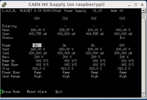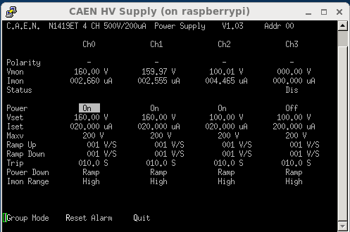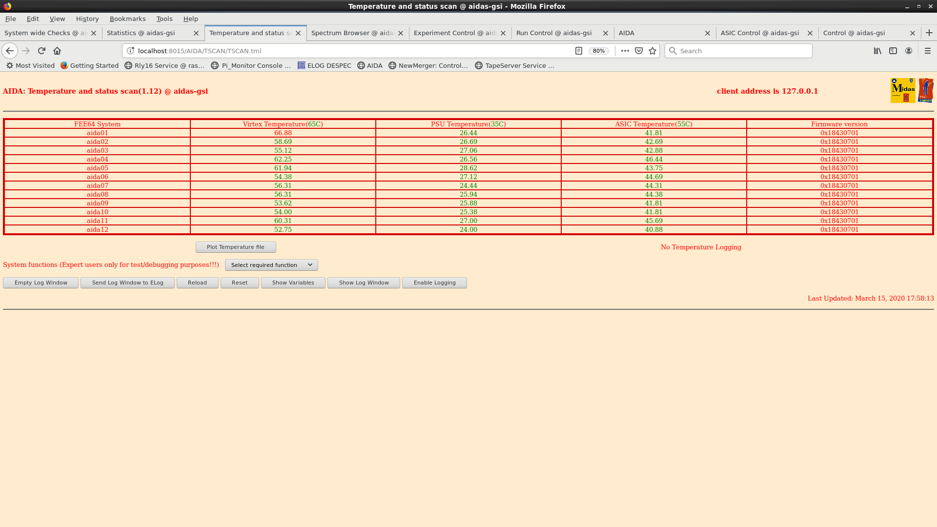 ASIC settings 2019Oct31-13.24.23 slow comparator 0xa BNC PB-5 pulser amplitude 1.0V , attenuator x1 frequency 2Hz decay time 1ms 07:46 all system wide checks ok good event statistics ok - attachment 1 FEE64 temperatures ok - attachment 2 detector bias/leakage currents ok - attachment 3 08:48 merger ok ~ 3 million data items/s TapeServer ok ~ 27 MB/s data forwarding to MBS ok 08:50 AIDA writing to file SecondDrive/TapeData/S480/R12_1524 09:56 all system wide checks ok good event statistics ok - attachment 4 detector bias/leakage currents ok - attachment 5 FEE64 temperatures ok - attachment 6 12:09 all system wide checks ok 12:13 all system wide checks ok good event statistics ok - attachment 7 FEE64 temperatures ok - attachment 8 detector bias/leakage currents ok, but ramping up - attachment 9 13:32 merger ok ~ 3 million data items/s TapeServer ok ~ 23 MB/s data forwarding to MBS ok Beam seems to be off 13:33 AIDA writing to file R12_1743 *update* checked DESPEC S480 Elog, issues with UNILAC, beam lost at 13:29 13:55 beam back 13:57 AIDA writing to file R12_1759 14:35 all system wide checks ok FEE64 temperatures ok - attachment 10 good event statistics ok - attachment 11 detector bias/leakage currents ok, but ramping up - attachment 12 15:18 merger ok ~ 2.7 million data items/s TapeServer ok ~ 27 MB/s data forwarding to MBS ok AIDA writing to file R12_1283 16:00 1.8.H high energy spectra - attachments 13 & 14 hit-rate spectra - attachment 15 16.22 all system wide checks okay FEE temperatures okay (attachment 16) leakage currents okay and recorded to spreadsheet (attachment 17) good event stats okay (attachment 18) merger running at 3M items/sec tape service running at 26MB/sec 18.00 began compressing R7 files with command: nice -n 10 gzip -v R7_* & all system wide checks okay FEE temperatures okay (attachment 19) leakage currents okay and recorded to spreadsheet (attachment 20) good event stats okay (attachment 21) merger running at 3M items/sec tape service running at 27MB/sec 20.10 all system wide checks okay FEE temperatures okay (attachment 22) leakage currents okay and recorded to spreadsheet, detectors 1 and 2 still rising (attachment 23) good event stats okay (attachment 24) merger running at 3M items/sec tape service running at 25MB/sec rates histogram (attachment 25) low energy histograms (attachment 26 and 27) high energy histograms (attachments 28 and 29) 22.07 all system wide checks okay FEE temperatures okay (attachment 30) leakage currents okay and recorded to spreadsheet (attachment 31) good event stats okay (attachment 32) merger running at 3M items/sec tape service running at 25MB/sec currently on R12_2097 23.56 all system wide checks okay FEE temperatures okay (attachment 33) leakage currents okay and recorded to spreadsheet (attachment 34) good event stats okay (attachment 35) merger running at 3M items/sec tape service running at 26MB/sec finishing up now. night shift group have been informed how to check up on AIDA, there is a sheet on the table with relevant information
