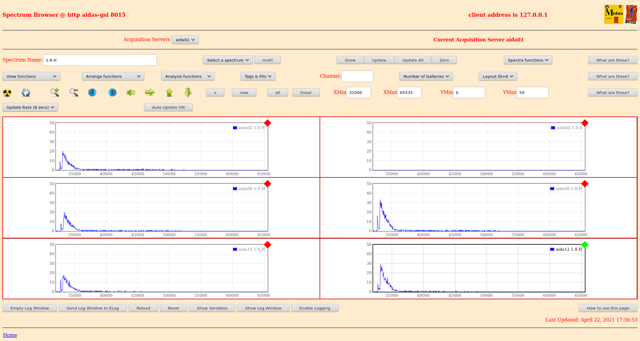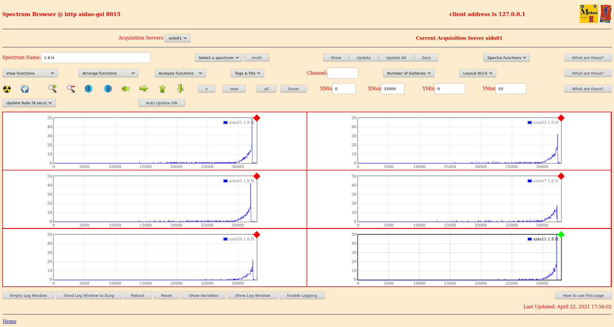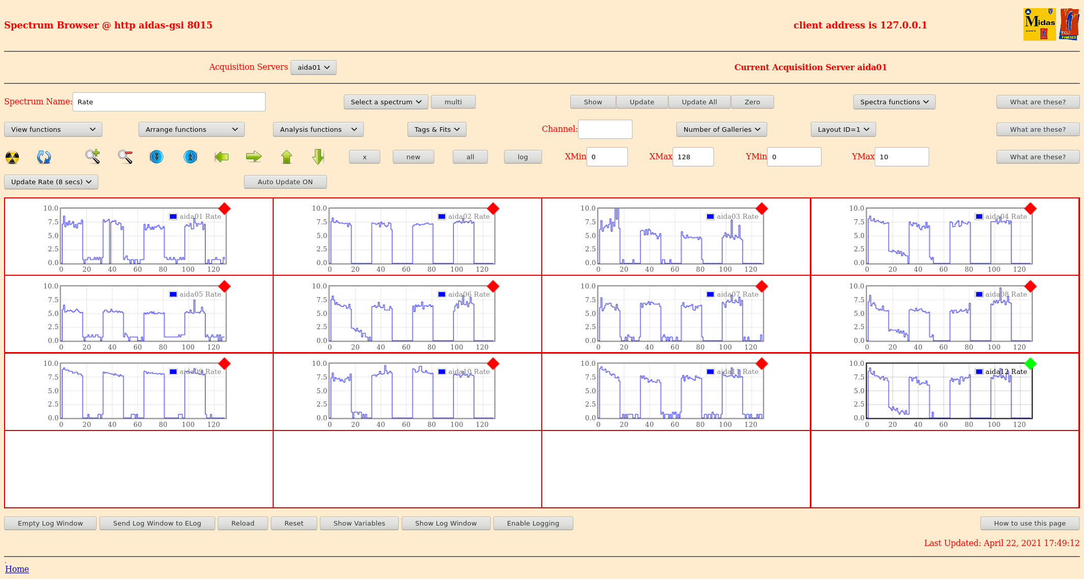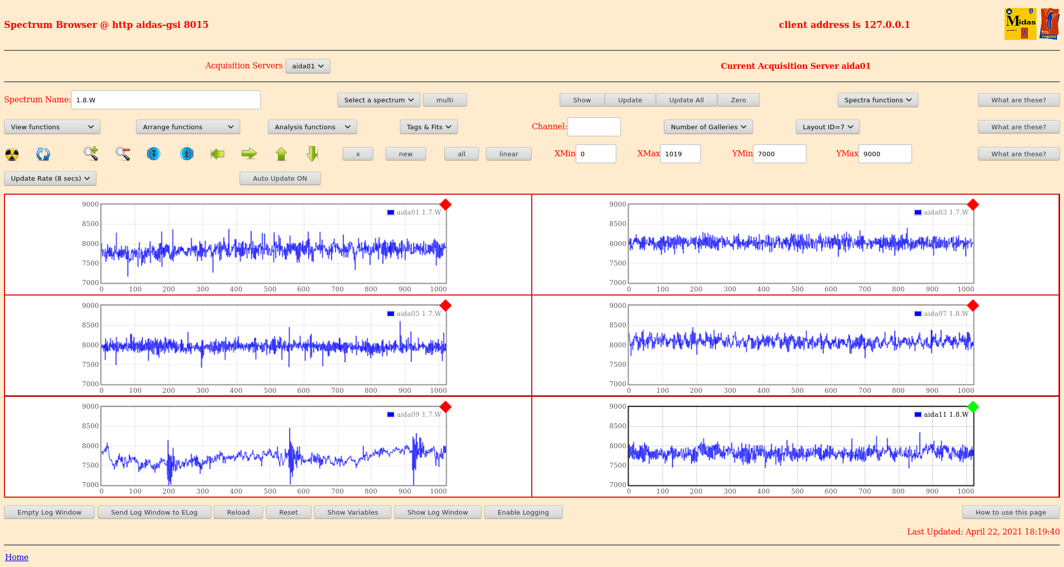 16.20 zero all histograms, statistics & merger statistics most recent merger error messages MERGE Data Link (29984): bad timestamp 6 3 0xc1ac7f1c 0x0dce7672 0x00002cda5dce7672 0x16782cda5dce7672 0x16782cda5dcf2032 MERGE Data Link (29984): bad timestamp 6 3 0xc18b7e62 0x0dce7e42 0x00002cda5dce7e42 0x16782cda5dce7e42 0x16782cda5dcf2032 MERGE Data Link (29984): bad timestamp 6 3 0xc1957ebc 0x0dce7e42 0x00002cda5dce7e42 0x16782cda5dce7e42 0x16782cda5dcf2032 MERGE Data Link (29984): bad timestamp 6 3 0xc1b67ecb 0x0dcf0ae2 0x00002cda5dcf0ae2 0x16782cda5dcf0ae2 0x16782cda5dcf2032 MERGE Data Link (29984): bad timestamp 6 3 0xc1957ea3 0x0dcf12b2 0x00002cda5dcf12b2 0x16782cda5dcf12b2 0x16782cda5dcf2032 MERGE Data Link (29984): bad timestamp 6 3 0xc1867fba 0x0b2ee142 0x00002dc9eb2ee142 0x16782dc9eb2ee142 0x16782dc9fad22532 MERGE Data Link (29984): bad timestamp 6 3 0x86800889 0x0ad28158 0x00002dc9eb2ee142 0x16782dc9ead28158 0x16782dc9fad22532 MERGE Data Link (29984): bad timestamp 6 3 0xc1be7e6e 0x0b2ef0e2 0x00002dc9eb2ef0e2 0x16782dc9eb2ef0e2 0x16782dc9fad2c172 MERGE Data Link (29984): bad timestamp 6 3 0xc1b08006 0x0b2f5e42 0x00002dc9eb2f5e42 0x16782dc9eb2f5e42 0x16782dc9fad34502 MERGE Data Link (29984): bad timestamp 6 3 0xc1807de7 0x0ad3c342 0x00002dc9eb2f6de2 0x16782dc9ead3c342 0x16782dc9fad34502 MERGE Statistics counters now cleared 16.21 merger server terminal reset & clear TapeData -> /media/ThirdDRive/TapeData [npg@aidas-gsi bin64]$ df -h Filesystem Size Used Avail Use% Mounted on /dev/mapper/vg_aidasgsi-lv_root 50G 13G 34G 28% / tmpfs 7.9G 559M 7.3G 7% /dev/shm /dev/sda2 477M 42M 410M 10% /boot /dev/sda1 200M 264K 200M 1% /boot/efi /dev/mapper/vg_aidasgsi-lv_home 401G 79G 302G 21% /home /dev/mapper/vg_aidas2-lv_home 7.2T 3.9T 2.9T 58% /media/1e121361-83d3-4825-b6ae-8700b07e0ca7 /dev/sdd1 7.2T 6.3T 605G 92% /media/SecondDrive /dev/sdc1 7.2T 3.6T 3.3T 52% /media/ThirdDrive at current rate (10.5Mb/s) we have 3.6d remaining 17.40 *all* system wide checks OK *except* FPGA timestamp errors Base Current Difference aida12 fault 0x0 : 0x51 : 81 FPGA Timestamp error counter test result: Passed 11, Failed 1 If any of these counts are reported as in error The ASIC readout system has detected a timeslip. That is the timestamp read from the time FIFO is not younger than the last Collecting the file size of each FEE64 Options CONTENTS file to check they are all the same FEE : aida01 => Options file size is 1026 Last changed Wed Apr 21 01:51:54 CEST 2021 FEE : aida02 => Options file size is 1014 Last changed Fri Apr 16 00:56:20 CEST 2021 FEE : aida03 => Options file size is 1014 Last changed Wed Apr 14 21:52:04 CEST 2021 FEE : aida04 => Options file size is 1025 Last changed Sat Apr 17 06:07:36 CEST 2021 FEE : aida05 => Options file size is 1025 Last changed Fri Apr 16 00:53:25 CEST 2021 FEE : aida06 => Options file size is 1014 Last changed Wed Apr 14 21:52:04 CEST 2021 FEE : aida07 => Options file size is 1014 Last changed Wed Apr 14 21:52:04 CEST 2021 FEE : aida08 => Options file size is 1014 Last changed Wed Apr 14 21:52:04 CEST 2021 FEE : aida09 => Options file size is 1014 Last changed Wed Apr 14 21:52:05 CEST 2021 FEE : aida10 => Options file size is 1014 Last changed Wed Apr 14 21:52:06 CEST 2021 FEE : aida11 => Options file size is 1014 Last changed Wed Apr 14 21:52:05 CEST 2021 FEE : aida12 => Options file size is 1025 Last changed Mon Apr 19 09:05:25 CEST 2021 17.43 FEE64 temps OK - attachment 1 statistics - attachments 2-8 per FEE64 rate spectra - attachments 9 & 10 1.8.L spectra - attachments 11-14 1.8.H spectra - attachments 15-16 1.8.W spectra 20us FSR - attachments 17-18 1.8.W spectra 200us, 2ms & 20ms FSR - attachments 19-21, 30-32 merger, tape server & merger statistics 19-25 ucesb - attachment 26 Grafana DSSD biases & leakage currents - attachment 27 taperserver & tapeserver/merger server terminals - no timewarp errors since c. 15.25 - attachment 28 DSSSD biases & leakage currents - attachment 29 22.17 *all* system wide checks OK *except* Base Current Difference aida01 fault 0x3612 : 0x3613 : 1 aida02 fault 0x523c : 0x523d : 1 aida03 fault 0xc5cd : 0xc5ce : 1 aida04 fault 0x14f1 : 0x14f2 : 1 aida05 fault 0x9a4e : 0x9a4f : 1 aida06 fault 0xfdd2 : 0xfdd3 : 1 aida07 fault 0x4a0 : 0x4a1 : 1 aida08 fault 0xc796 : 0xc797 : 1 White Rabbit error counter test result: Passed 4, Failed 8 Understand the status reports as follows:- Status bit 3 : White Rabbit decoder detected an error in the received data Status bit 2 : Firmware registered WR error, no reload of Timestamp Status bit 0 : White Rabbit decoder reports uncertain of Timestamp information from WR Base Current Difference aida12 fault 0x0 : 0x57 : 87 FPGA Timestamp error counter test result: Passed 11, Failed 1 If any of these counts are reported as in error The ASIC readout system has detected a timeslip. That is the timestamp read from the time FIFO is not younger than the last Collecting the file size of each FEE64 Options CONTENTS file to check they are all the same FEE : aida01 => Options file size is 1026 Last changed Wed Apr 21 01:51:54 CEST 2021 FEE : aida02 => Options file size is 1014 Last changed Fri Apr 16 00:56:20 CEST 2021 FEE : aida03 => Options file size is 1014 Last changed Wed Apr 14 21:52:04 CEST 2021 FEE : aida04 => Options file size is 1025 Last changed Sat Apr 17 06:07:36 CEST 2021 FEE : aida05 => Options file size is 1025 Last changed Fri Apr 16 00:53:25 CEST 2021 FEE : aida06 => Options file size is 1014 Last changed Wed Apr 14 21:52:04 CEST 2021 FEE : aida07 => Options file size is 1014 Last changed Wed Apr 14 21:52:04 CEST 2021 FEE : aida08 => Options file size is 1014 Last changed Wed Apr 14 21:52:04 CEST 2021 FEE : aida09 => Options file size is 1014 Last changed Wed Apr 14 21:52:05 CEST 2021 FEE : aida10 => Options file size is 1014 Last changed Wed Apr 14 21:52:06 CEST 2021 FEE : aida11 => Options file size is 1014 Last changed Wed Apr 14 21:52:05 CEST 2021 FEE : aida12 => Options file size is 1025 Last change