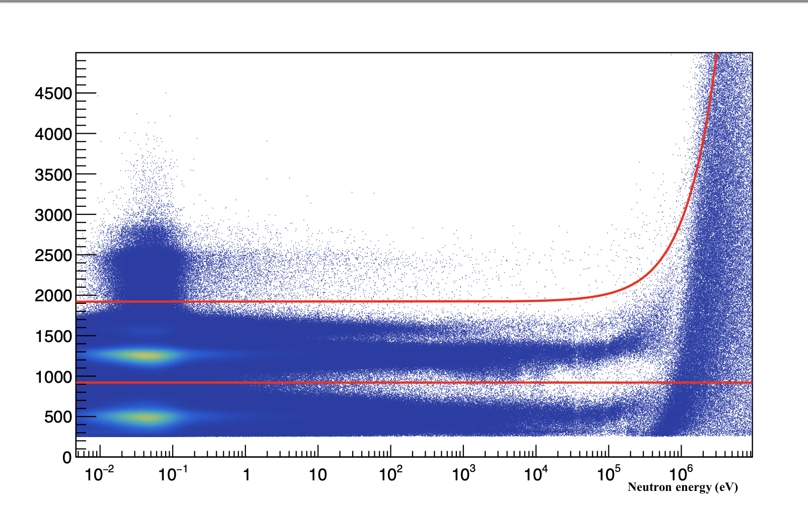 Comparison strip 6 amplitude spectra anew (red) vs (old) processing (Screenshot). Slight shift in amplitude and slightly less counts with new processing in t+alpha peaks (1% level). This could be either due to less noise background, shift in neutron energy calibration (amplitude spectra shown with a cut of 100 keV). pdf plot shows new vs old for neutron energy vs counts. only minor differences at low neutron energy, new processing makes spectra cleaner at higher energy.